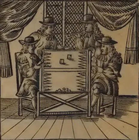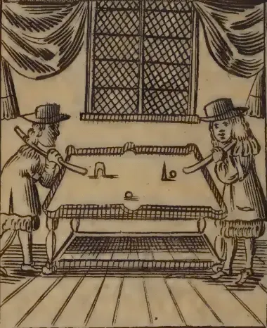 First up, billiards, but this isn’t the American “pool” you may be familiar with. In the section on billiards, Cotton describes a components called a “port” and a “king” which I believe are the little arch and the little cone on the table in the woodcut. Whoever can knock their ball closest to the king goes first. There are only two balls, one for each player, and if I’m understanding Cotton’s olde dialect properly you have to knock your ball through the port without knocking it over and then hit the king to win. You lose by knocking your ball into a “hazzard” (the pockets) or by having your ball knocked into a hazard by your opponent’s ball. It seems a lot closer to something like lawn bowling, but on a smaller scale so you can play it indoors.