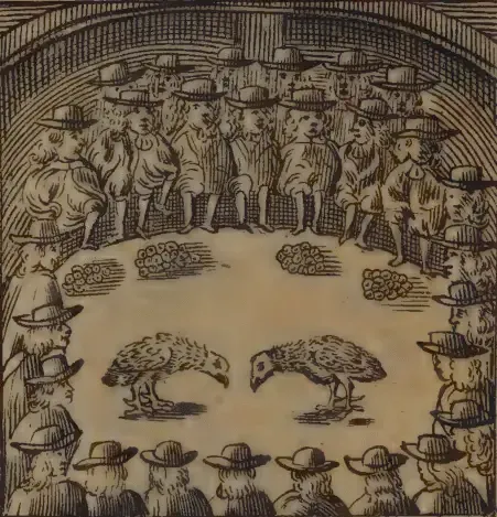 In matching, take notice of these two things; first, the length of Cocks, secondly, the strength of Cocks; for the length, if your Adversaries Cock be too long, yours shall hardly catch his head, and so be incapable of indangering eye or life; and if he be the stronger, he will overbear your Cock, and not suffer him to rise or strike with any advantage. […] You shall know the dimension of the garth by the measure of your hands, griping the Cock about from the points of your great finger to the joynts of your thumbs, and either of these advantages by no means give your Adversary; if you doubt loss in the one, be sure to gain in the other: for the week long Cock will rise at more ease, and the short strong Cock will give the surer blow.